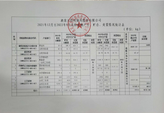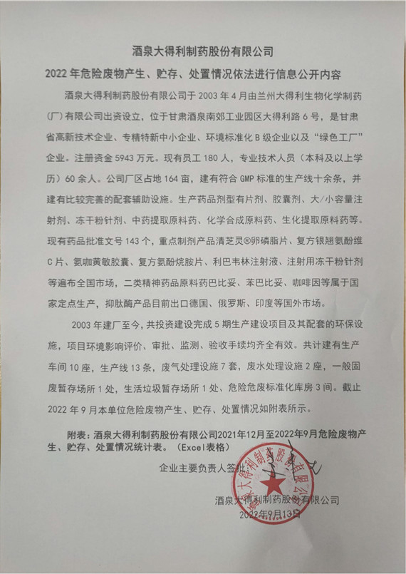 酒泉大得利制藥股份有限公司2022年危險廢物產生、貯存、處置情況依法進行信息公開內容